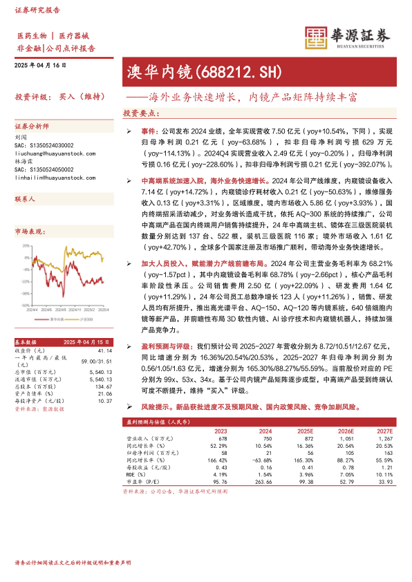 澳华内镜2024年营收实现增长,主要得益于海外业务的快速扩张和国内中高端产品的推广。虽然净利润因成本和费用增加而有所下降,但公司在研发和销售方面的投入为未来的增长奠定了基础。维持“买入”评级,但需关注新品获批进度、政策变化和市场竞争等风险因素。