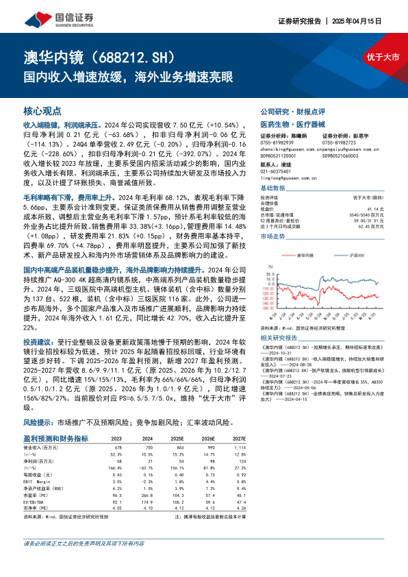 本报告分析了澳华内镜2024年的财务业绩,指出公司面临国内市场增长放缓和利润端承压的挑战,但海外业务表现亮眼。报告同时下调了公司未来盈利预测,但考虑到行业回暖的预期和公司在海外市场的拓展潜力,维持“优于大市”的投资评级。投资者应关注市场推广、竞争加剧和汇率波动等风险。