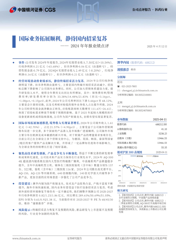 投资建议:澳华内镜为国产软镜龙头,技术及产品优势凸显,产线丰富度不断提升,海外市场快速拓展,国内业务有望受益于医疗设备招采活力复苏。考虑到外部经营环境修复节奏仍有一定不确定性,我们调整并预测公司2025-2027年归母净利润至0.82/1.23/1.86亿元,同比增长289.61%/50.69%/51.05%,EPS分别为0.61/0.92/1.38元,当前股价对应2025-2027年PE为68/45/30倍,维持“谨慎推荐”评级。