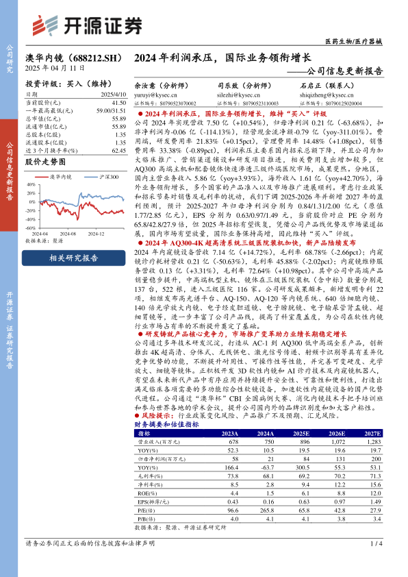 澳华内镜在2024年面临国内招采政策和费用投入增加带来的利润压力,导致归母净利润同比大幅下滑。然而,公司营收仍保持增长,其中海外业务表现强劲,同比增长42.70%,成为重要的增长亮点。公司在中高端产品(如AQ300-4K系统)的市场渗透方面取得显著进展,成功进入多家三级医院。同时,澳华内镜持续加大研发投入,推出了多款创新产品,丰富了产品线,并积极布局3D软性内镜和AI诊疗技术等前沿领域,以巩固核心竞争力并加速国产化替代。尽管短期盈利预测有所下调,但鉴于2025年招标市场有望恢复,以及公司在产品线优势、市场渠道拓展和国际业务高增长方面的潜力,开源证券维持其“买入”评级,认为公司具备长期稳定增长的潜力。投资者需关注行业政策变化、产品推广效果及汇兑风险。