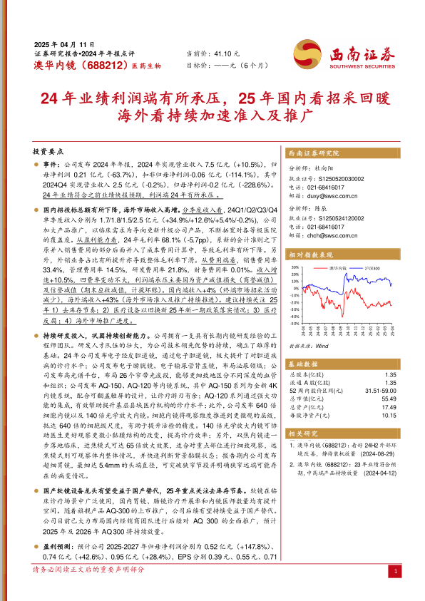 澳华内镜2024年业绩利润端承压,但海外市场表现亮眼,研发投入持续加大,新产品不断推出。公司有望受益于国产替代趋势和AQ-300的推广,预计2025年业绩将迎来改善。建议关注去库存节奏、医疗设备以旧换新政策、医疗反腐以及海外市场推广进度等因素。