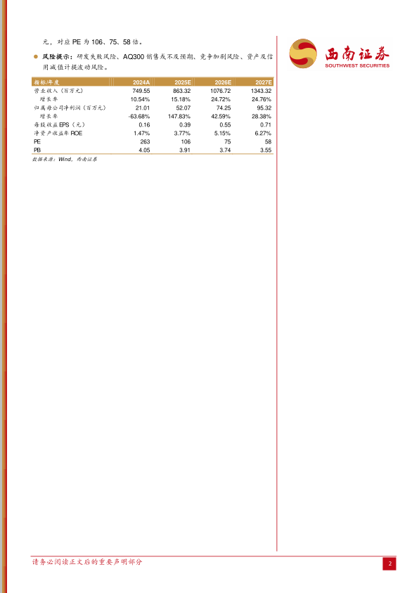 风险提示:研发失败风险、AQ300销售或不及预期、竞争加剧风险、资产及信用减值计提波动风险。