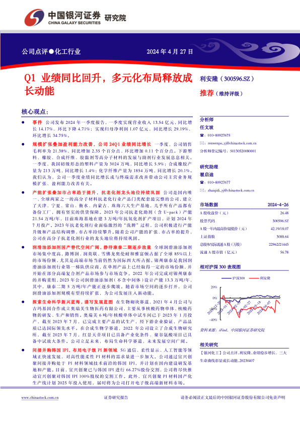 利安隆2024年一季度业绩表现亮眼,营收和利润均实现同比增长。公司在高分子材料抗老化剂领域的龙头地位稳固,并通过多元化业务布局,积极拓展新的增长点。在润滑油添加剂、生命科学和电子级PI材料等领域,公司均有较大发展潜力。维持“推荐”评级,但需关注下游需求、原材料价格和新建项目达产等风险。