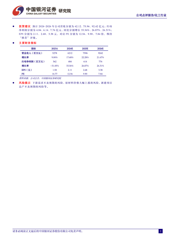 风险提示 下游需求不及预期的风险,原材料价格大幅上涨的风险,新建项目达产不及预期的风险等。