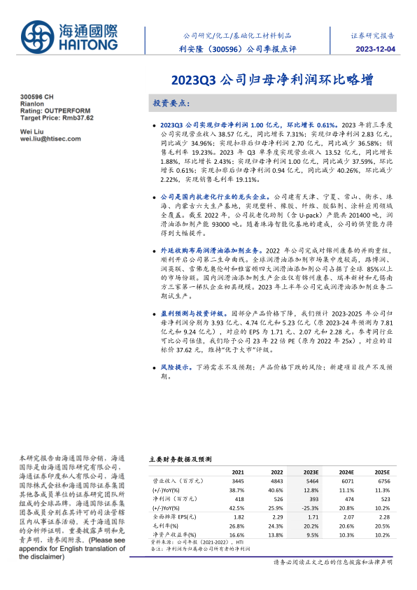 鉴于部分产品价格下降,分析师对利安隆的盈利预测进行了调整。预计2023-2025年公司归母净利润分别为3.93亿元、4.74亿元和5.23亿元(原2023-2024年预测为7.81亿元和9.24亿元),对应的每股收益(EPS)分别为1.71元、2.07元和2.28元。
