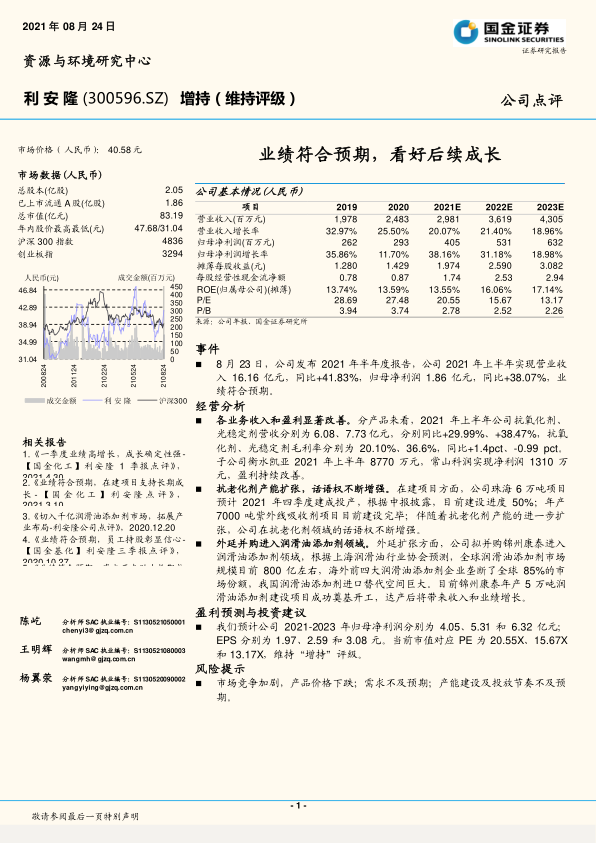 利安隆公司2021年上半年业绩表现强劲,营业收入和归母净利润均实现高速增长,符合市场预期。公司在核心抗老化剂业务上通过产能扩张持续巩固市场地位,珠海6万吨项目和紫外线吸收剂项目将为未来增长提供坚实基础。同时,公司通过外延并购锦州康泰,成功切入高增长潜力的润滑油添加剂市场,有望受益于国内进口替代趋势,开辟新的增长极。尽管面临市场竞争、需求波动和产能建设等风险,但基于其稳健的业绩增长、清晰的产能扩张计划和前瞻性的战略布局,公司未来成长确定性较强,维持“增持”评级。