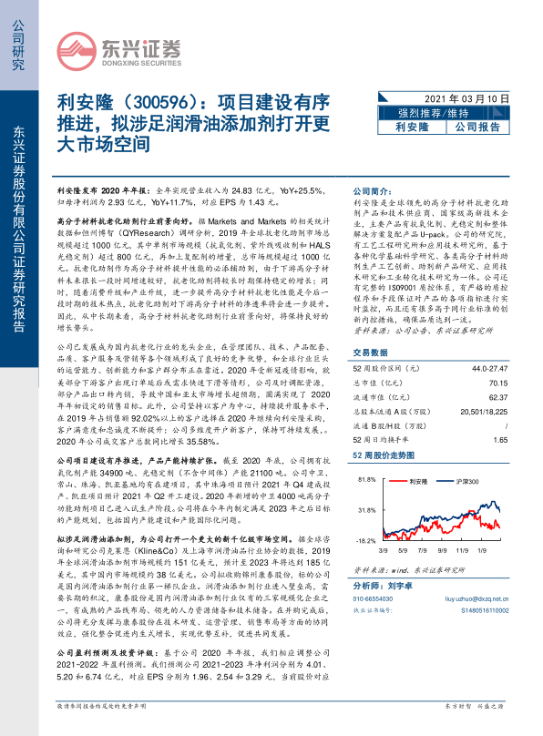 本报告分析了利安隆在高分子材料抗老化助剂行业的领先地位和发展前景,指出行业市场规模巨大且持续增长。公司通过项目建设和产能扩张,不断提升竞争力,并积极布局润滑油添加剂领域,有望打开更大的市场空间。维持“强烈推荐”评级。