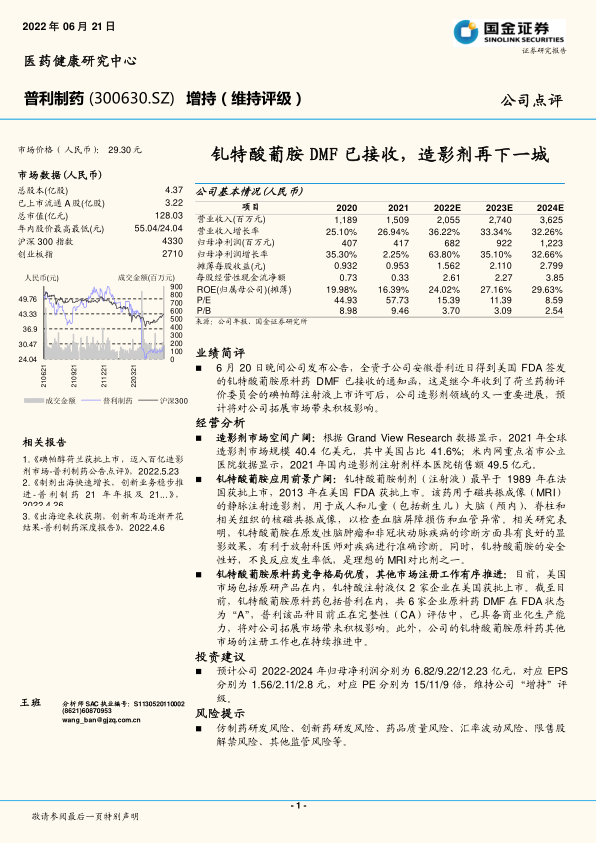 普利制药在造影剂领域取得关键性突破,钆特酸葡胺原料药获得美国FDA接收函,进一步巩固了其在全球市场的战略布局。公司受益于广阔的造影剂市场空间、钆特酸葡胺优良的应用前景和有利的竞争格局。财务数据显示,公司未来业绩将持续保持高增长态势,预计2022-2024年归母净利润将实现显著增长,对应估值具有吸引力。综合来看,公司具备较强的投资价值,建议维持“增持”评级,但投资者需关注研发、质量、汇率及监管等潜在风险。