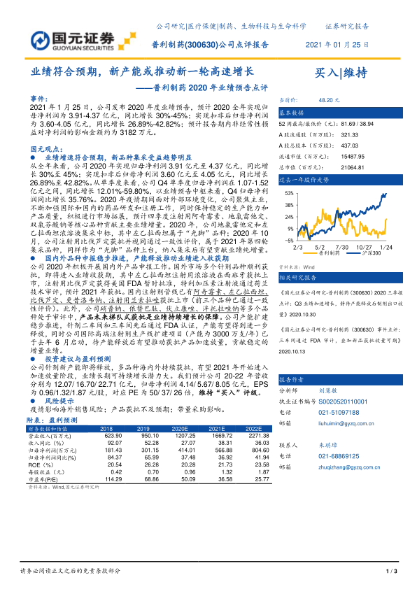 本报告分析了普利制药2020年业绩预告,认为公司业绩符合预期,集采品种受益明显,国内外产品申报稳步推进,产能释放可期。维持“买入”评级,并预测公司未来营收和净利润将保持增长。同时,报告也提示了疫情、产品获批和带量采购等风险。