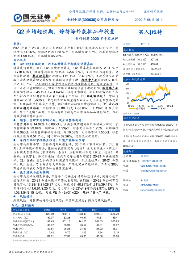 本报告对普利制药(300630)2020年半年度报告进行了分析,核心观点如下: