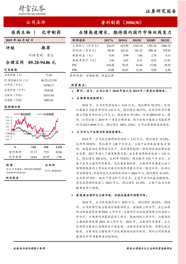 # 中心思想 * **业绩高速增长与市场双线发力预期** * 普利制药2018年业绩保持高速增长,四大产品线均实现快速增长,同时积极拓展海外市场,并加大研发投入,为未来发展奠定基础。 * 公司作为国内为数不多的注射剂领域的国际化先导企业,有望在国内外市场双线发力,拉动业绩高增,因此首次覆盖给予“推荐”评级。 # 主要内容 * **事件概述与业绩表现** * 公司公告了2018年年报以及2019年一季度业绩预告,业绩保持高速增长。2018年营收同比增长92.07%,归母净利润同比增长84.37%,扣非后归母净利润同比增长97.19%,EPS为0.99元。预计2019年一季度归母净利润同比增长100%-125%。 * **四大产品线增长分析** * 抗过敏药物:收入同比增长74.34%,毛利率提升1.08个百分点,主要产品为地氯雷他定,具有原料制剂一体化的优势。 * 抗生素类药物:收入同比增长209.41%,毛利率提升5.02个百分点,主要产品为注射用阿奇霉素、克拉霉素制剂等,注射用阿奇霉素通过一致性评价,拉动业绩增长。 * 非甾体抗炎类药物:收入同比增长42.34%,毛利率同比下降0.57个百分点,主要产品为双氯芬酸制剂。 * 消化类药物:收入同比增长43.19%,主要产品为马来酸曲美布汀制剂。 * **国际化战略与海外市场拓展** * 2018年海外收入同比增长29.83%。多个注射液产品获得荷兰、德国、美国、澳大利亚等地的上市许可。注射用阿奇霉素、左乙拉西坦注射液已出口到美国,其他产品也将陆续向国外供货,对公司国内外市场拓展带来积极影响。 * **研发投入与产品线扩充** * 2018年研发费用投入同比增长118.18%,占营业收入比重22.14%。公司坚持“首仿+独家+差异化+原料制剂一体”的定位,重点研发具有差异化的药品,拥有30余项正在进行的注射剂研发项目。 * **期间费用率分析** * 2018年销售费用率同比提升0.37个百分点,主要因为加大了产品市场推广力度;管理费用率(包含研发费用)同比提升1.03个百分点,主要是公司加大了研发投入;财务费用率同比下降0.60个百分点。公司整体期间费用略有提升。 * **盈利预测与投资评级** * 预计公司2019-2021年营业收入为11.42/17.01/24.67亿元,归母净利润为3.41/5.09/7.56亿元,同比增长88.1%/49.2%/48.5%,EPS为1.86/2.78/4.13元,对应目前股价PE为41.60/27.88/18.78倍。给予公司2019年48-51倍PE,股价合理区间为89.28-94.86元,首次覆盖给予“推荐”评级。 * **风险提示** * 药品招标降价;海外品种获批不及预期;国内市场销售不及预期。 # 总结 * **普利制药增长动力与投资价值** * 普利制药凭借其四大产品线的快速增长、积极的国际化战略和持续的研发投入,实现了业绩的高速增长。 * 考虑到公司在注射剂领域的领先地位以及国内外市场双线发力的潜力,该报告首次覆盖给予“推荐”评级,但同时也提示了药品招标降价、海外品种获批不及预期以及国内市场销售不及预期等风险。
