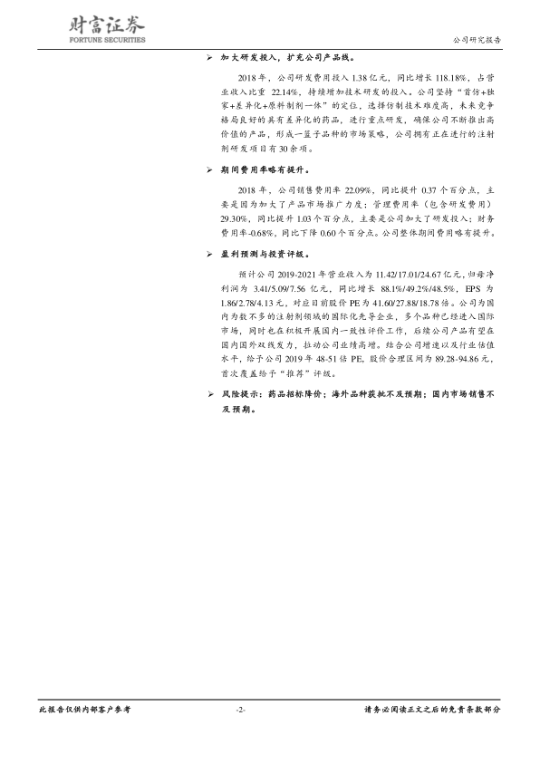 • 考虑到公司在注射剂领域的领先地位以及国内外市场双线发力的潜力,该报告首次覆盖给予“推荐”评级,但同时也提示了药品招标降价、海外品种获批不及预期以及国内市场销售不及预期等风险。