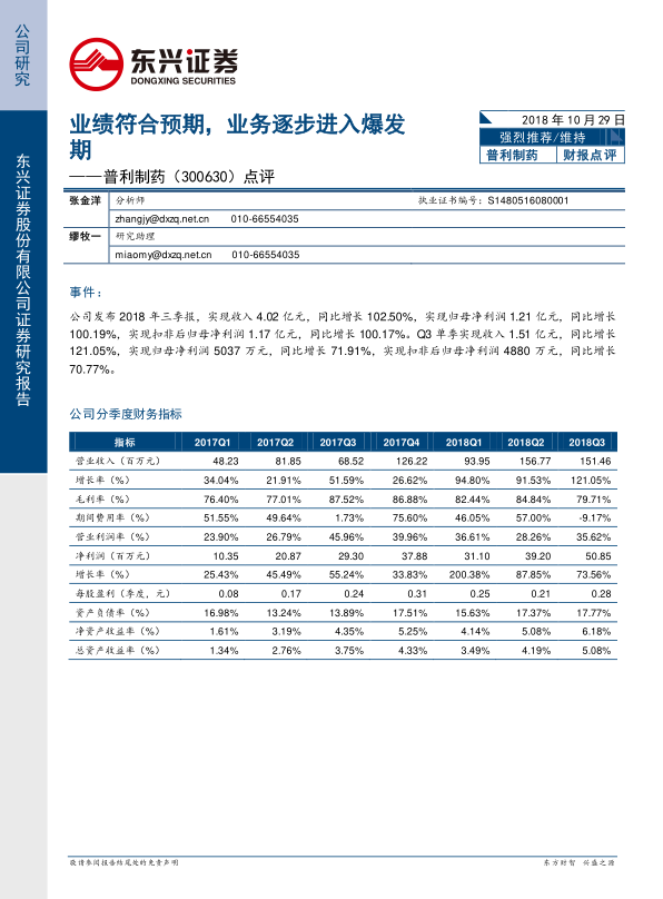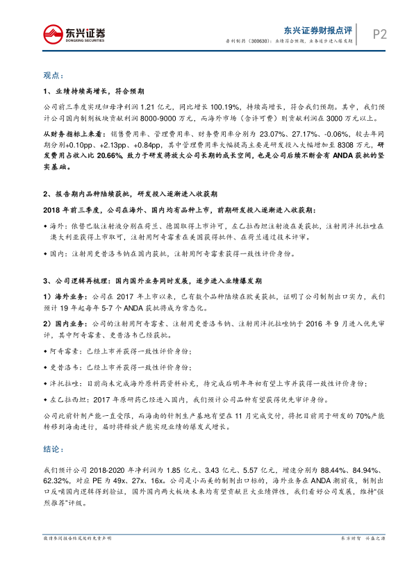 本报告的核心观点是普利制药的业绩持续高增长,符合预期,并且未来几年有望保持高速增长。预计公司2018-2020年净利润将显著增长,维持“强烈推荐”评级。