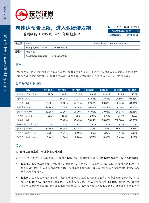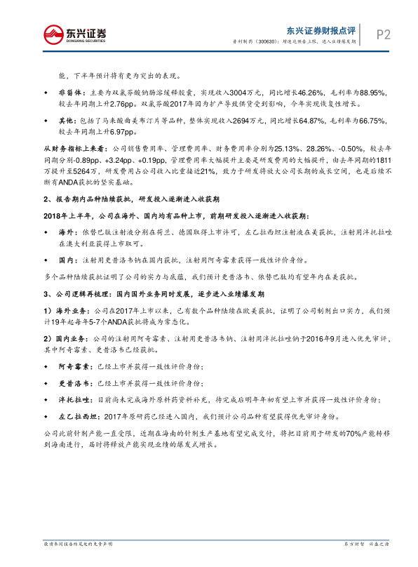 普利制药在2018年上半年展现出强劲的业绩增长势头,归母净利润同比增长125.17%,达到业绩预告上限。这一增长得益于抗过敏、抗生素等核心产品线的销售高速增长,以及公司在研发方面的大力投入,使得多个国内外品种陆续获批上市,研发成果逐渐进入收获期。公司通过国内外业务协同发展的战略,在海外市场持续获得ANDA批准,在国内市场也加速推进一致性评价和优先审评。随着海南针剂生产基地的产能释放,公司有望迎来业绩的爆发式增长。东兴证券维持“强烈推荐”评级,预计公司2018-2020年净利润将分别达到1.85亿元、3.51亿元和5.78亿元,对应增速分别为88.00%、89.72%和64.67%。公司作为“小而美”的制剂出口标的,其海外业务在ANDA潮前夜,制剂出口反哺国内的逻辑得到验证,国内外两大板块未来均有望贡献巨大的业绩弹性。