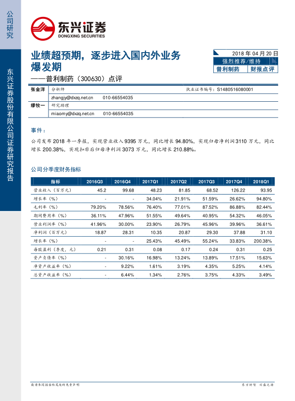 公司2018年一季报显示,营业收入和归母净利润均大幅增长,超出市场预期。