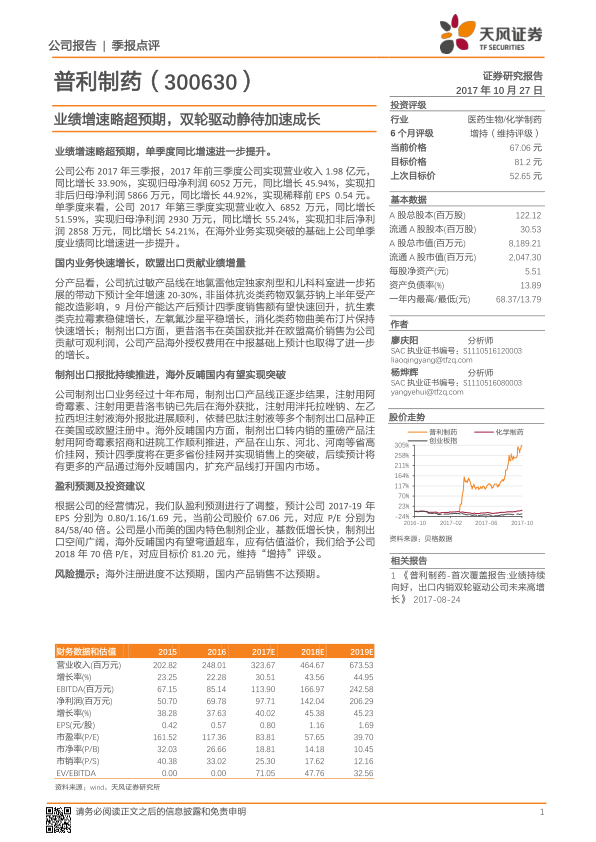 普利制药在2017年前三季度展现出超出预期的强劲业绩增长,尤其第三季度单季度的营收和净利润增速均超过50%。公司通过国内抗过敏、非甾体抗炎、抗生素及消化类药物的快速增长,以及更昔洛韦等制剂在欧盟市场的高价销售,成功构建了“国内+海外”的双轮驱动发展模式。未来,随着注射用阿奇霉素等海外获批产品在国内市场的推广,以及更多制剂出口品种的持续报批,公司有望实现“海外反哺国内”的战略突破,进一步扩充产品线并打开国内市场。分析师上调了盈利预测,并维持“增持”评级,认为公司作为特色制剂企业,具备广阔的增长空间和估值溢价潜力,但需关注海外注册进度和国内销售情况的风险。