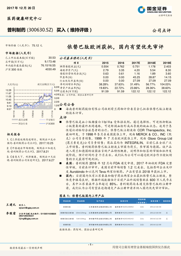 本报告分析了普利制药依替巴肽注射液在欧洲获批的进展,并展望了其在美国和国内市场的潜力。报告强调了公司在制剂出口方面的竞争优势,并预测了公司未来几年的盈利增长。基于这些分析,维持对普利制药的“买入”评级。