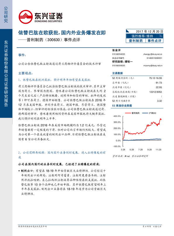 本报告的核心在于分析普利制药依替巴肽在欧洲获批事件,并探讨其对公司国内外业务的影响。主要观点包括: