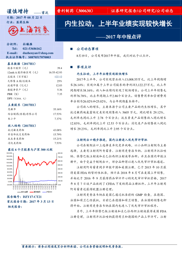 本报告对普利制药(300630)2017年中报进行了分析,核心观点如下: