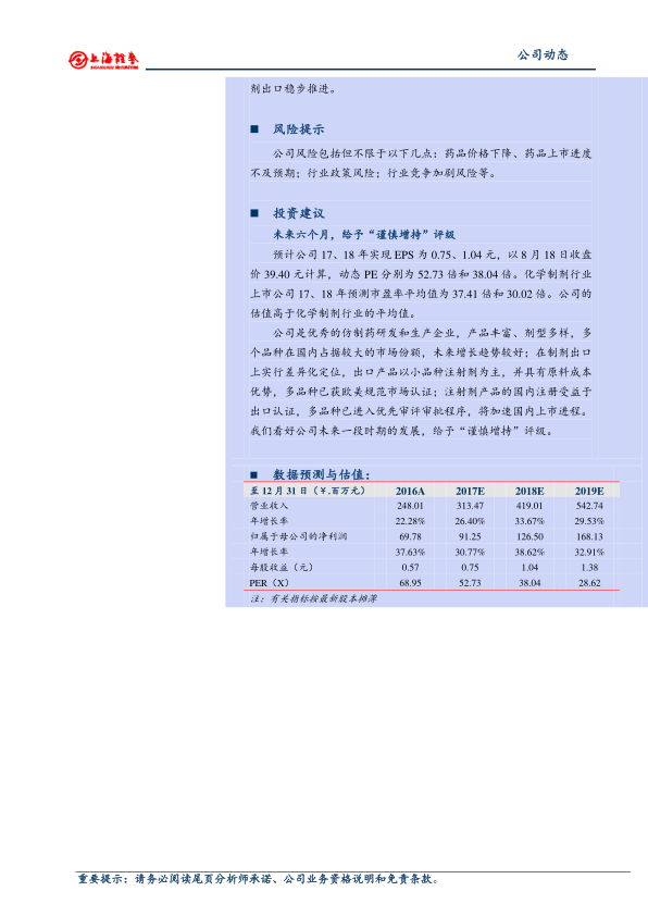 本报告对普利制药的中报进行了深入分析,公司凭借内生增长和差异化的制剂出口战略,实现了业绩的快速增长。虽然公司估值高于行业平均水平,但考虑到其在仿制药研发和生产方面的优势,以及在国内外市场的拓展潜力,维持“谨慎增持”评级。投资者应关注药品价格、上市进度、行业政策和竞争等风险因素,并结合自身情况做出投资决策。