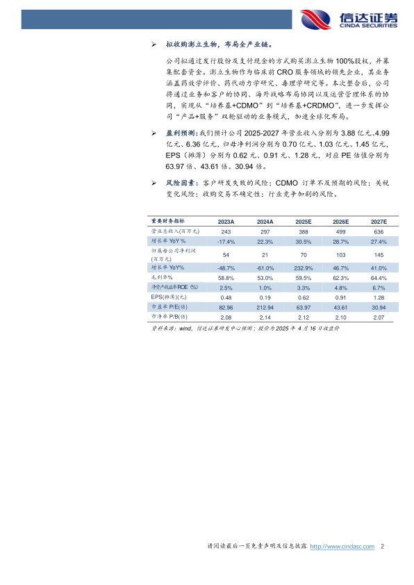 公司拟通过发行股份及支付现金的方式购买澎立生物100%股权,并募集配套资金。澎立生物作为临床前CRO服务领域的领先企业,其业务涵盖药效学评价、药代动力学研究、毒理学研究等。本次整合后,公司将通过业务和客户的协同、海外战略布局协同以及运营管理体系的协同,实现从“培养基+CDMO”到“培养基+CRDMO”,进一步发挥公司“产品+服务”双轮驱动的业务模式,加速全球化布局。