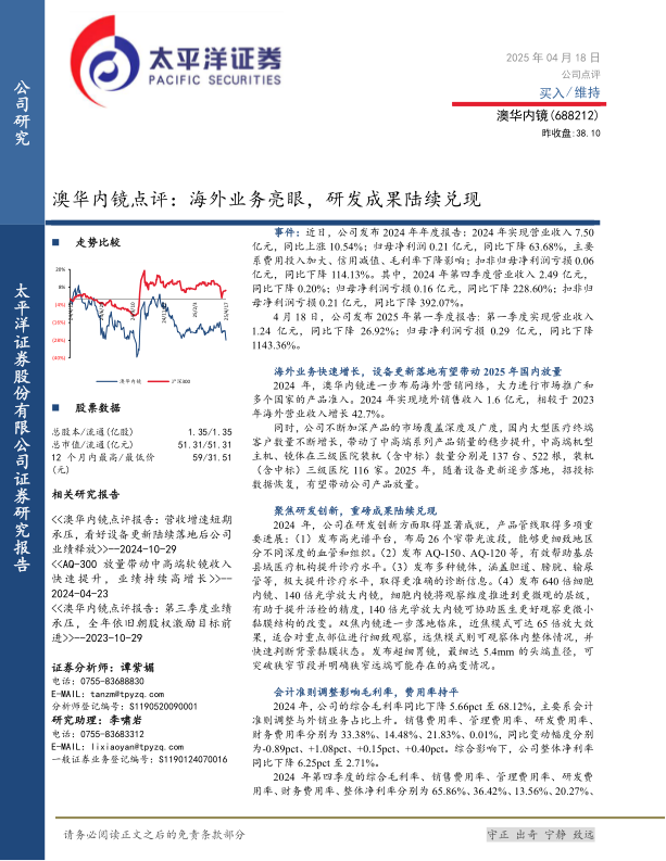 澳华内镜在2024年及2025年第一季度面临短期业绩压力,主要表现为净利润下滑,这与公司加大费用投入、信用减值及毛利率下降有关。然而,公司在海外市场取得了显著增长,境外销售收入同比增长42.7%,显示出强大的国际市场拓展能力。同时,公司持续聚焦研发创新,成功推出了高光谱平台、AQ系列产品、多种新型镜体以及细胞内镜、双焦内镜等一系列重磅成果,极大地丰富了产品管线并提升了技术竞争力。展望未来,随着国内医疗设备更新政策的逐步落地,以及公司在研发和市场布局上的持续投入,预计澳华内镜的业绩将在2025-2027年实现高速增长。尽管存在设备集采降价、政策落地不及预期等风险,但公司凭借其在海外市场的亮眼表现和持续的研发创新能力,仍具备较强的长期增长潜力。