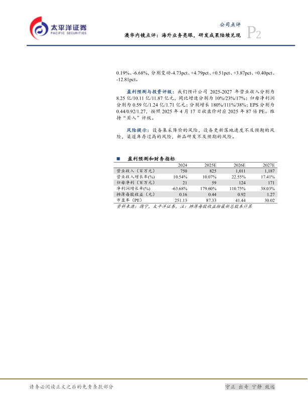 太平洋证券预计澳华内镜2025-2027年营业收入分别为8.25亿、10.11亿、11.87亿元,同比增速分别为10%、23%、17%。归母净利润分别为0.59亿、1.24亿、1.71亿元,分别同比增长180%、111%、38%。摊薄每股收益(EPS)分别为0.44、0.92、1.27元。基于2025年4月17日收盘价,对应2025年87倍PE。维持“买入”评级。