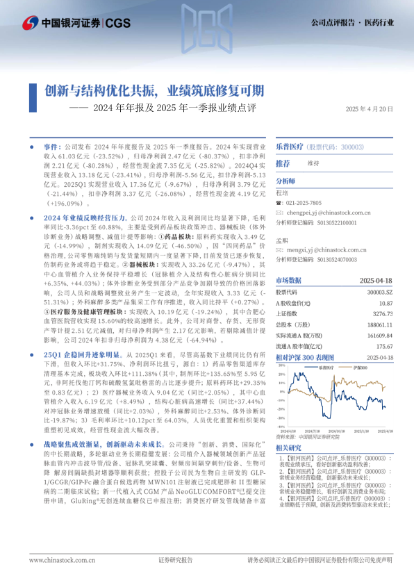 25Q1企稳回升迹象明显。从2025Q1来看,尽管高基数下业绩同比仍有所下滑,但收入环比+31.75%、净利润环比扭亏,源自:1)药品零售渠道库存清理基本完成,板块收入环比+111.38%(其中,制剂环比+135.65%至5.95亿元,非阿托伐他汀钙和硫酸氢氯吡格雷的占比逐步提升;原料药环比+29.35%至0.83亿元);2)医疗器械业务收入9.04亿元(同比+2.05%),其中心血管植介入收入6.19亿元(+8.49%),结构心脏病高速增长(同比+37.44%)对冲冠脉业务增速放缓(同比+2.03%),外科麻醉同比+2.53%、体外诊断同比-19.87%;3)毛利率环比+10.12pct至64.03%,人员优化重置和组织架构重塑初见成效,经营性现金流大幅改善。