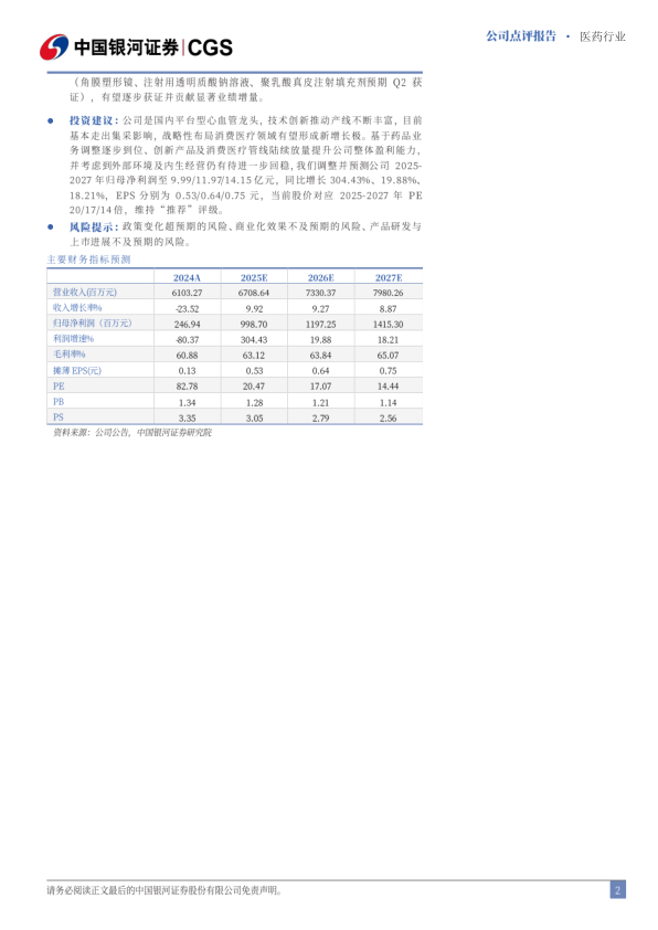 投资建议:公司是国内平台型心血管龙头,技术创新推动产线不断丰富,目前基本走出集采影响,战略性布局消费医疗领域有望形成新增长极。基于药品业务调整逐步到位、创新产品及消费医疗管线陆续放量提升公司整体盈利能力,并考虑到外部环境及内生经营仍有待进一步回稳,我们调整并预测公司 2025-2027年归母净利润至9.99/11.97/14.15亿元,同比增长304.43%、19.88%、18.21%,EPS分别为0.53/0.64/0.75元,当前股价对应 2025-2027年PE 20/17/14倍,维持“推荐”评级。