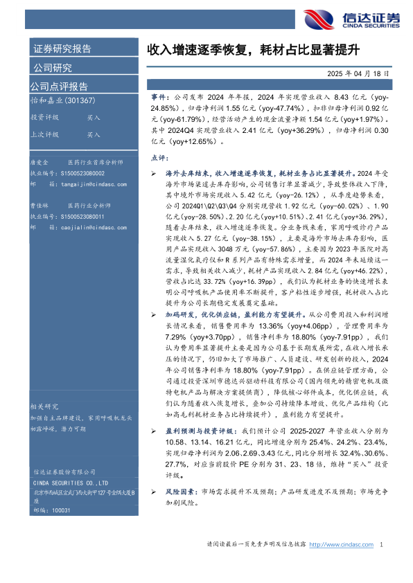 本报告分析了公司2024年业绩,指出受海外去库影响,公司整体收入下降,但四季度收入增速已恢复。耗材业务占比显著提升,表明公司产品使用率和客户粘性增强。公司加大研发投入和优化供应链,有望提升盈利能力。维持“买入”评级,但需关注市场需求、研发进度和市场竞争等风险因素。
