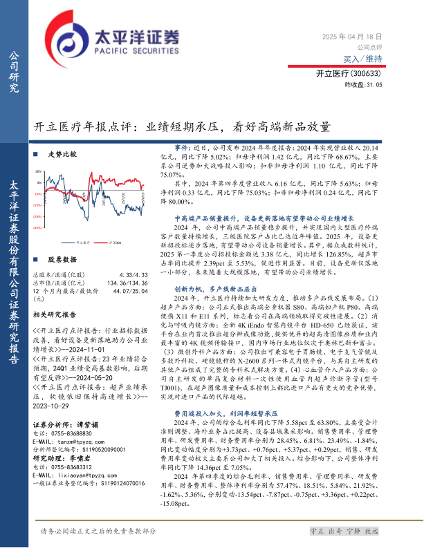 2024年,开立医疗实现营业收入20.14亿元,同比下降5.02%;归母净利润1.42亿元,同比下降68.67%;扣非归母净利润1.10亿元,同比下降75.07%。其中,第四季度营业收入6.16亿元,同比下降5.63%;归母净利润0.33亿元,同比下降75.03%;扣非归母净利润0.24亿元,同比下降80.00%。业绩下滑主要归因于公司在市场逆势下加大了战略投入。