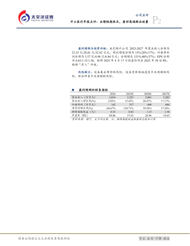 太平洋证券预计开立医疗2025-2027年营业收入分别为23.25亿/28.01亿/32.82亿元,同比增速分别为15%/20%/17%;归母净利润分别为3.57亿/4.98亿/6.84亿元,分别增长151%/40%/37%。摊薄每股收益(EPS)分别为0.83/1.15/1.58元。基于2025年4月17日收盘价,对应2025年38倍PE。维持“买入”评级。