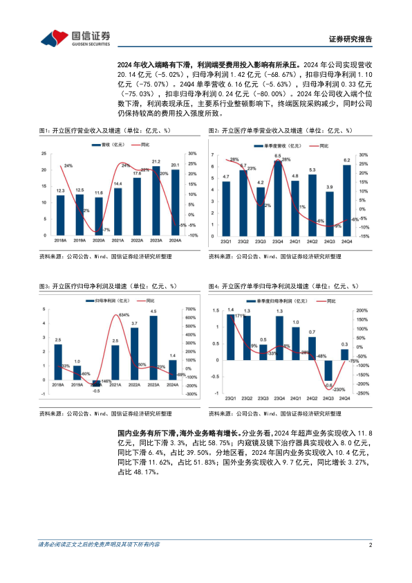 开立医疗在2024年经历了业绩短期承压,营收同比下降5.02%至20.14亿元,归母净利润同比大幅下滑68.67%至1.42亿元。这主要归因于行业整顿导致医院采购减少,以及公司为增强长期竞争力而持续加大的销售和研发投入,使得各项费用率显著提升。尽管国内业务受挫,海外业务仍保持3.27%的增长韧性。公司在超声和软镜领域持续创新,推出了S80、P80等高端超声设备,以及搭载iEndo智慧内镜平台的HD650等前沿内窥镜产品,这些高端新品有望成为未来业绩增长的核心驱动力。展望未来,随着行业招投标环境的逐步改善和高端新品的放量,公司业绩预计将从2025年起实现显著反弹,归母净利润有望实现高速增长。国信证券维持“优于大市”评级,认可公司在行业低谷期的战略投入将为长期发展奠定坚实基础。