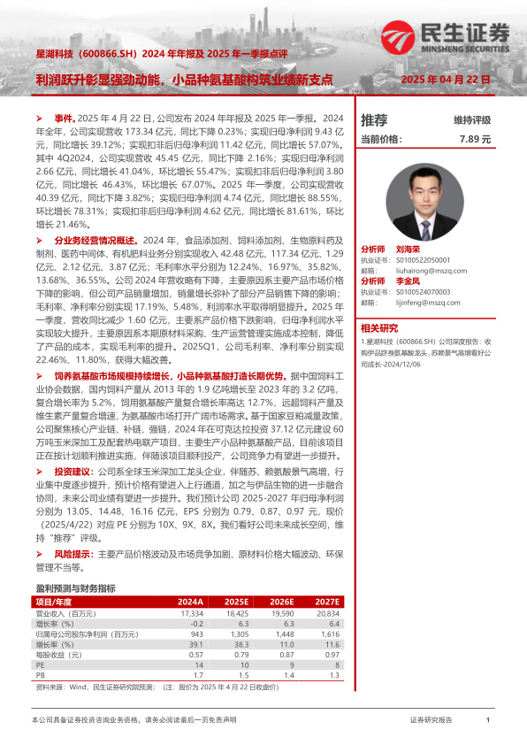 2024年年报及2025年一季报点评:利润跃升彰显强劲动能,小品种氨基酸构筑业绩新支点