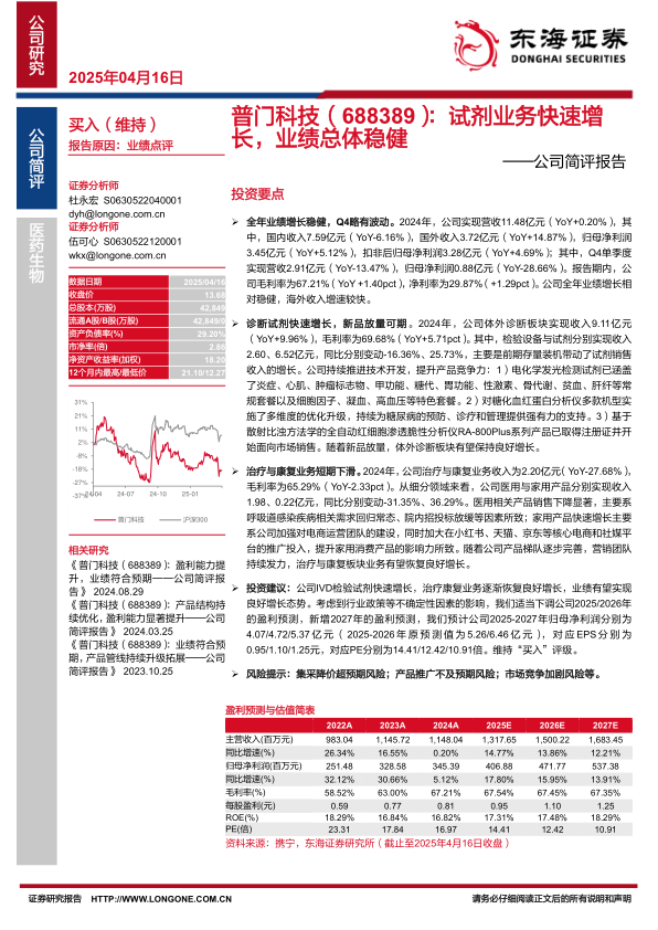 本报告分析了普门科技2024年的业绩表现,诊断试剂业务快速增长,治疗与康复业务短期下滑,但未来有望恢复。考虑到行业政策等不确定性因素的影响,下调公司2025/2026年的盈利预测,新增2027年的盈利预测,维持“买入”评级。同时,报告也提示了集采降价、产品推广不及预期以及市场竞争加剧等风险。