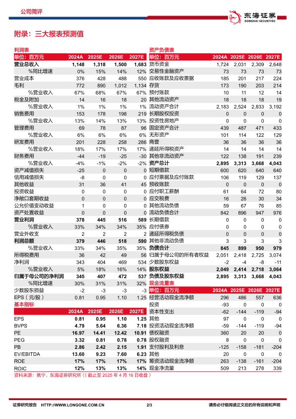 全年业绩增长稳健,Q4略有波动。2024年,公司实现营收11.48亿元(YoY+0.20%),其中,国内收入7.59亿元(YoY-6.16%),国外收入3.72亿元(YoY+14.87%),归母净利润3.45亿元(YoY+5.12%),扣非后归母净利润3.28亿元(YoY+4.69%);其中,Q4单季度实现营收2.91亿元(YoY-13.47%),归母净利润0.88亿元(YoY-28.66%)。报告期内,公司毛利率为67.21%(YoY+1.40pct),净利率为29.87%(+1.29pct)。公司全年业绩增长相13.68对稳健,海外收入增速较快。