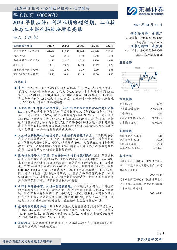 本报告对华东医药2024年年报进行了全面分析,认为公司业绩增长略超预期,工业板块和工业微生物板块是增长的主要驱动力。公司在仿创转型和创新药管线储备方面取得了显著进展,为未来的发展奠定了基础。 尽管医美板块受到宏观经济和消费需求的影响,但国内医美业务仍然保持增长。 维持“买入”评级,但同时也提示了新产品研发、市场推广以及医药行业政策等方面的风险。