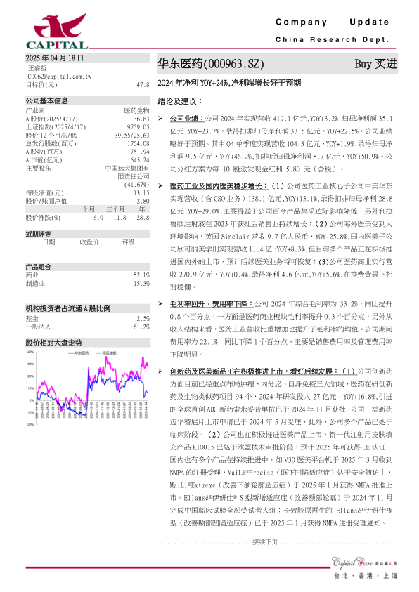 华东医药在2024年展现了强劲的财务表现,营收和净利润均实现稳健增长,特别是归母净利润同比增长23.7%,超出市场预期。公司在医药工业领域通过核心产品和新获批产品的推动实现了显著增长,同时国内医美业务也保持了积极的发展态势。毛利率的提升和费用率的下降反映了公司良好的经营效率和成本控制能力。展望未来,华东医药在创新药和医美新品研发及上市方面的积极布局,将为其提供持续的增长动力。分析师基于对公司未来发展的乐观预期,给予“买进”评级,并预计未来三年净利润将保持双位数增长。