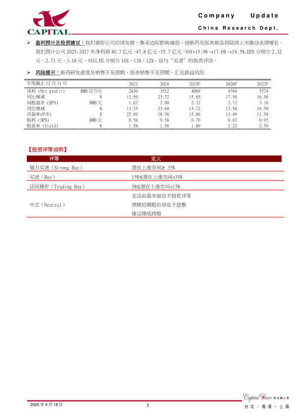 盈利预计及投资建议:我们看好公司后续发展,集采边际影响减弱,创新药及医美新品将陆续上市推动业绩增长。我们预计公司2025-2027年净利润40.7亿元、47.8亿元、55.7亿元,YOY+15.9%、+17.6%、+16.5%,EPS分别为2.32元、2.73元、3.18元,对应PE分别为16X、13X、12X,给与“买进”的投资评级。