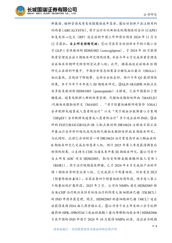 创新产品加速上市,自主研发持续突破。2024年公司医药工业研发投入(不含股权投资)26.78亿元,同比增长16.77%,其中直接研发支出17.70亿元,同比增长10.63%,直接研发支出占医药工业营收比例为12.91%。公司目前医药在研项目合计133个,其中创新产品及生物类似药项目94个。2024年公司多个创新产品获批上市:①独家商业化的CAR-T产品赛恺泽®自3月获批上市以来已完成认证及备案的国内医疗机构数量超过200家,截止2024年12月31日已向合作方科济药业下达154份有效订单;②独家商业化的乌司奴单抗注射液生物类似药赛乐信®为国内首家获批上市,已获批适应症为成年及儿童斑块状银屑病,此外,用于克罗恩病的上市许可申请和补充申请已于今年2月获得受理;③公司引进的全球首创ADC新药索米妥昔单抗注射液(爱拉赫®)已于2024年11月获NMPA附条件批准上市,适应症为适用于既往接受过1-3线系统性治疗的叶酸受体α(FRα)阳性的铂类耐药的上皮性卵巢癌、输卵管癌或原发性腹膜癌成年患者。④全球创新产品注射用利纳西普(ARCALYST®),用于治疗冷吡啉相关的周期性综合征(CAPS)和复发性心包炎(RP)适应症的中国上市申请分别在2024年11月与12月获批。自主研发持续突破:①公司具有全球创新水平的口服小分子GLP-1受体激动剂HDM1002(conveglipron),于2024年10月获得体重管理适应症Ⅱ期临床研究顶线结果,并在今年4月完成体重管理适应症临床Ⅲ期研究的首例受试者入组;此外,糖尿病适应症临床II期研究正在顺利开展中,中期分析盲态结果显示糖化血红蛋白(HbA1c)相比基线,呈线性下降趋势,总体安全性良好,预计今年Q3获得顶线结果,并于今年下半年进入III期临床研究。②GLP-1R/GIPR双靶点长效多肽类激动剂HDM1005(poterepatide)注射液,已在中国获批2型糖尿病、超重或肥胖人群的体重管理、代谢相关脂肪性肝病(MAFLD)/代谢相关脂肪性肝炎(MASH)、“用于阻塞性睡眠呼吸暂停(OSA)合并肥胖或超重成人患者的治疗”以及“用于射血分数保留心力衰竭(HFpEF)合并肥胖或超重成人患者的治疗”多个适应症的IND。③在研的FGF21R/GCGR/GLP-1R三靶点激动剂DR10624注射液目前正在开展治疗合并肝纤维化高风险的代谢相关脂肪性肝病II期临床研究。与此同时,此前已启动的另一项DR10624治疗重度高甘油三酯血症的II期临床研究已完成全部患者入组,预计2025年第三季度获得揭盲后的顶线结果,以支持与CDE沟通未来开展III期临床研究。④公司首个自主研发ADC项目HDM2005,靶向受体酪氨酸激酶样孤儿受体1(ROR1),用于治疗晚期恶性肿瘤,已于2024年8月完成该产品的中国Ⅰ期临床首例受试者入组,已完成前三个剂量爬坡,均未发生DLT(剂量限制性毒性)。目前在第四个剂量爬坡给药阶段,同步进入第三个剂量组的扩展阶段。2025年2月,公司向NMPA递交HDM2005联合R-CHP治疗既往未经系统性治疗的弥漫大B细胞淋巴瘤(DLBCL)的IND申请并获受理,同月,HDM2005的套细胞淋巴瘤(MCL)适应症获得美国FDA孤儿药资格认定。⑤公司首个自主研发的小分子抗肿瘤药物HPK-1PROTAC(造血祖激酶1蛋白降解靶向嵌合体)HDM2006片在中国的IND申请于2024年10月获得NMPA批准,适应症为晚期实体瘤。2025年1月,HDM2006片美国IND申请获得FDA批准,适应症为晚期恶性肿瘤。此外,公司自主研发具特色创新靶点的ADC项目HDM2020、HDM2012和HDM2017均计划2025年Q2/Q3递交中国和美国的IND申请。