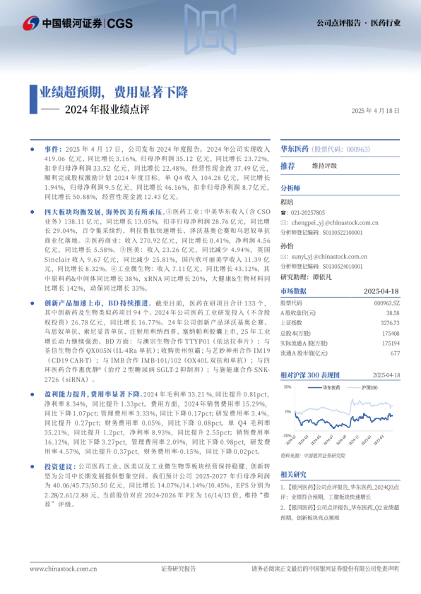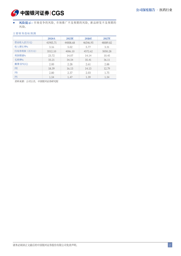 投资建议:公司医药工业、医美以及工业微生物等板块经营保持稳健,创新转型为公司中长期发展提供想象空间。我们预计公司2025-2027年归母净利润为40.06/45.73/50.50亿元,同比增长14.07%/14.14%/10.45%,EPS分别为2.28/2.61/2.88元,当前股价对应2024-2026年PE为16/14/13倍,维持“推荐”评级。