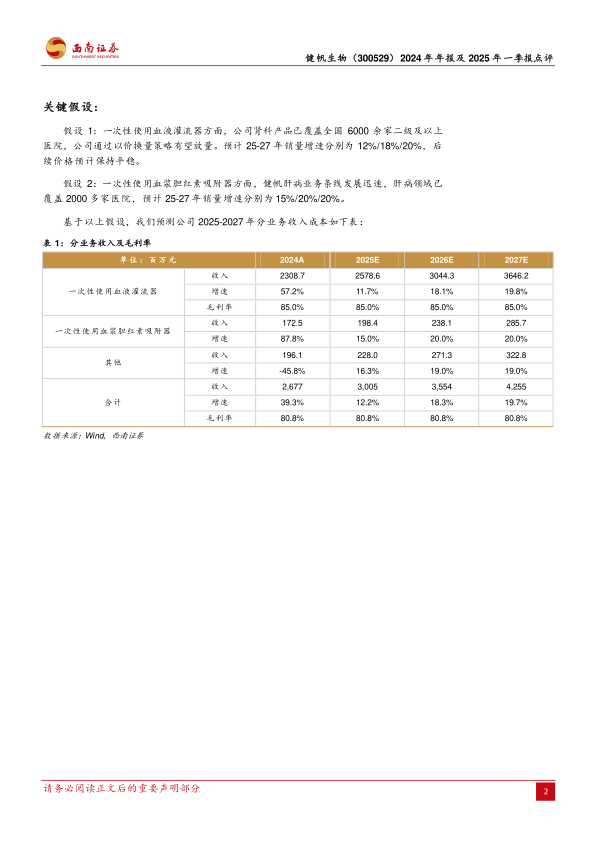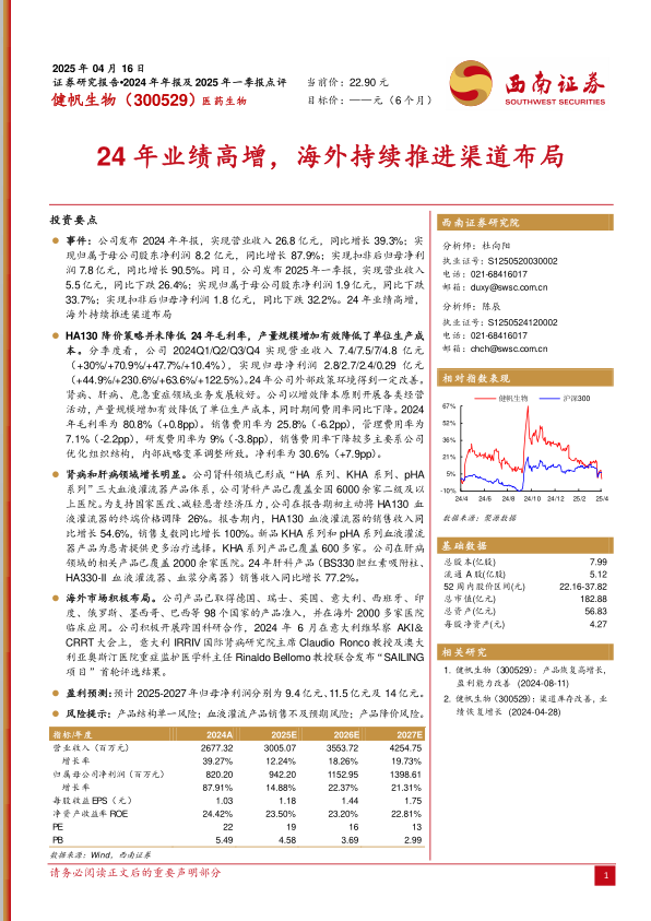 本报告对健帆生物(300529)2024年年报及2025年一季报进行了深入分析,核心观点如下: