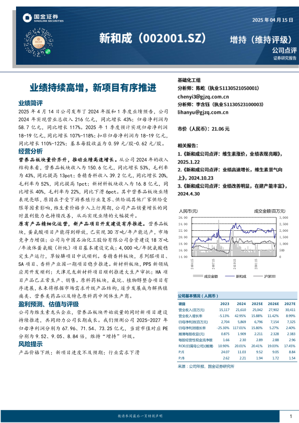 本报告对新和成2024年业绩和2025年一季度业绩预告进行了简评,分析了营养品、香精香料和新材料三大板块的经营情况和项目进展。报告指出,营养品板块的量价齐升是公司业绩增长的主要驱动力,同时公司积极推进新项目建设,为长期发展奠定基础。报告预测了公司未来三年的盈利情况,并维持“增持”评级,但同时也提示了产品价格下跌、新项目进度不及预期和行业需求下滑等风险。