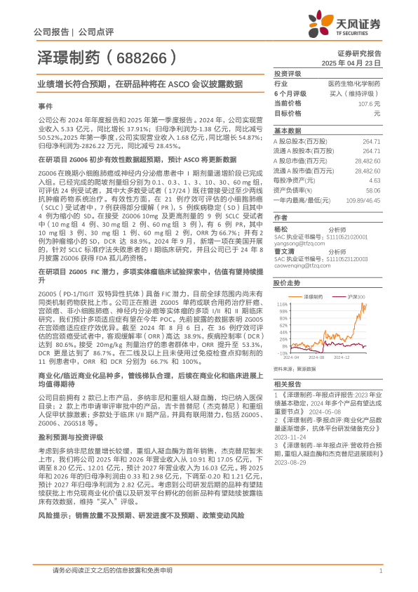 本报告对泽璟制药(688266)2024年年度报告和2025年第一季度报告进行了分析,维持“买入”评级,报告核心观点如下: