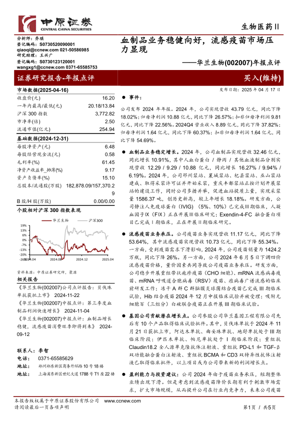 尽管2024年业绩短期下滑,但分析师对华兰生物的未来发展持积极态度,维持“买入”评级。