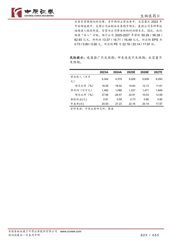 盈利能力与投资建议:公司2024年由于疫苗业务承压,短期整体业绩出现下滑。但是考虑到流感疫苗降价长期有利于刺激市场需求,扩大市场规模,从而提升公司在行业内竞争力,未来公司疫苗业务有望保持向好态势。另外两项主营业务中,采浆量从2023年开始增速提升,支撑公司血制品业务稳步增长;基因公司多种单抗陆续进入临床阶段,有望为公司带来新的利润增长点。因此,我们维持“买入”评级,预计公司2025-2027年营收50.29/56.39/62.93亿元,净利润13.37/14.71/16.49亿元,对应的EPS为0.73/0.80/0.90元,对应的PE为22.16/20.14/17.97倍。