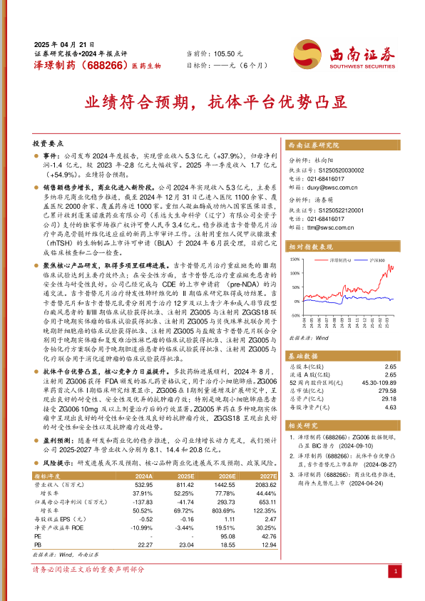 本报告对泽璟制药(688266)2024年报进行点评,核心观点如下: