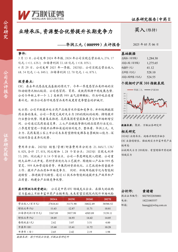 本报告分析了华润三九2024年年报和2025年一季报,指出公司短期业绩受到流感高基数等因素影响而承压。