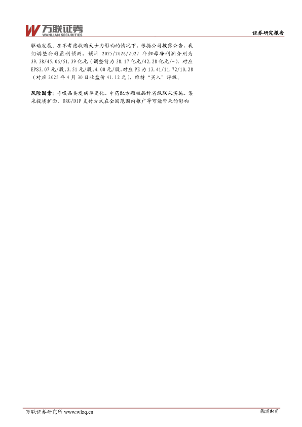驱动发展。在不考虑收购天士力影响的情况下,根据公司披露公告,我们调整公司盈利预测,预计2025/2026/2027年归母净利润分别为39.38/45.06/51.39亿元(调整前为38.17亿元/42.28亿元/-),对应EPS3.07元/股、3.51元/股、4.00元/股,对应PE为13.41/11.72/10.28(对应2025年4月30日收盘价41.12元),维持“买入”评级。