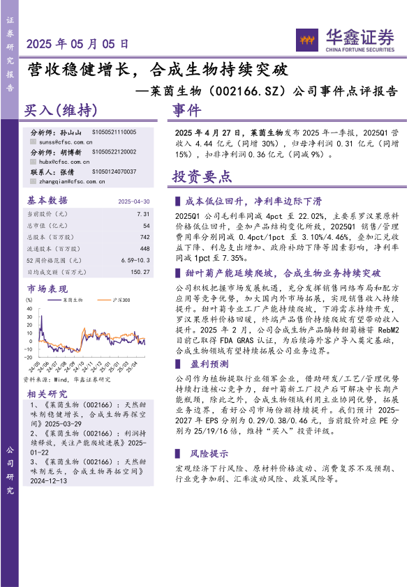 公司作为植物提取行业领军企业,借助研发/工艺/管理优势持续打造核心竞争力,甜叶菊新工厂投产后可解决中长期产能瓶颈,除此之外,合成生物领域利用主业协同优势,拓展业务边界,看好公司市场份额持续提升。我们预计2025-2027年EPS分别为0.29/0.38/0.46元,当前股价对应PE分别为25/19/16倍,维持“买入”投资评级。